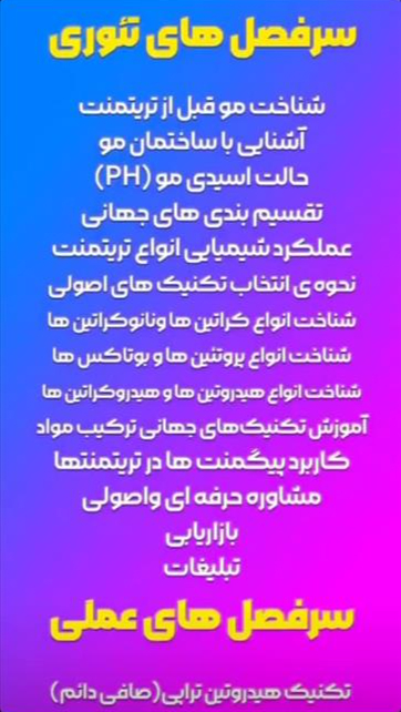 اولین چیزی که خیلی مهمه و شما برای انجام آن نگران هستید احیا و صافی موهای آسیب دیده است که شما در این دوره کاملا تخصصی و تکمیل آموزش میبینی که موهای آسیب دیده 100٪ صاف و 100٪ احیا بشن اون هم فقط و فقط در یک جلسه!
